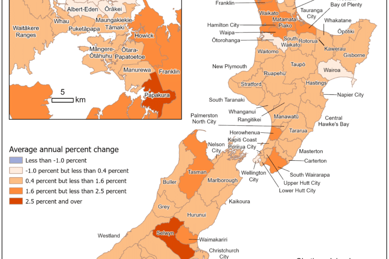 In Auckland, some local board areas like Waitematā, Devonport-Takapuna, and Waiheke have seen almost no growth, while Ōrākei and Albert-Eden have had small declines. The main reason for slow growth or decline in these areas is more people moving away to other parts of Auckland or New Zealand.